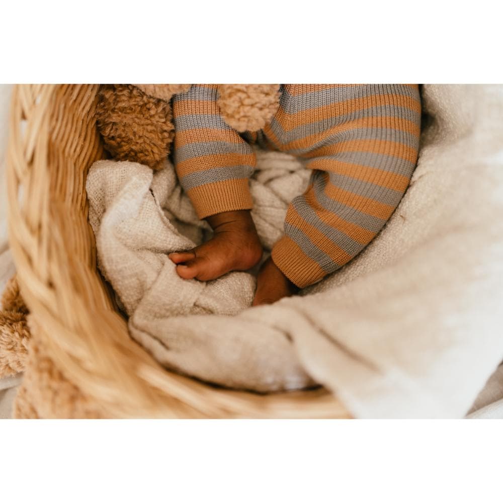 Combineer de A Tiny Story – Baby pants Cookie/Steel met een zachte romper of een trui van ons merk voor een complete, stijlvolle outfit die je kleintje warm houdt.