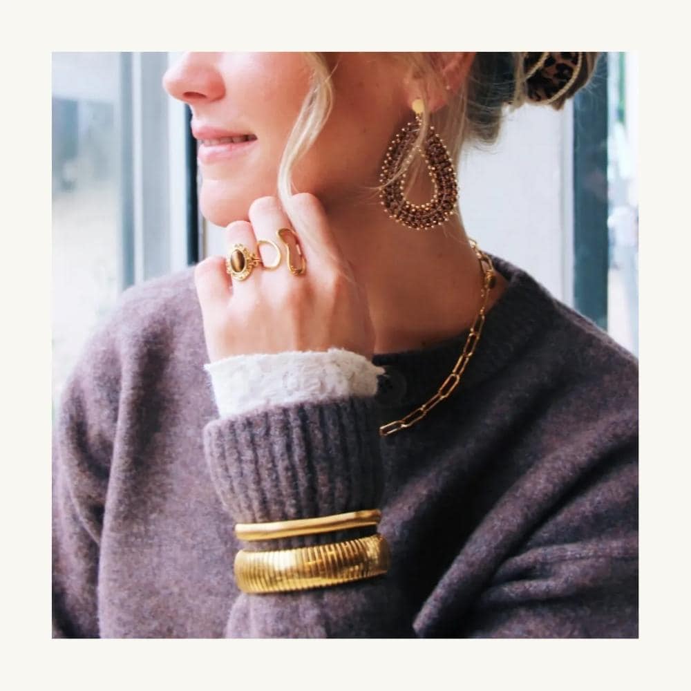 Deze retro bangle is jouw nieuwe statement piece. Dankzij de stretch sluit de armband perfect aan om je pols, zonder gedoe met sluitingen. Combineer met andere armbanden of draag deze statement piece solo voor instant impact!