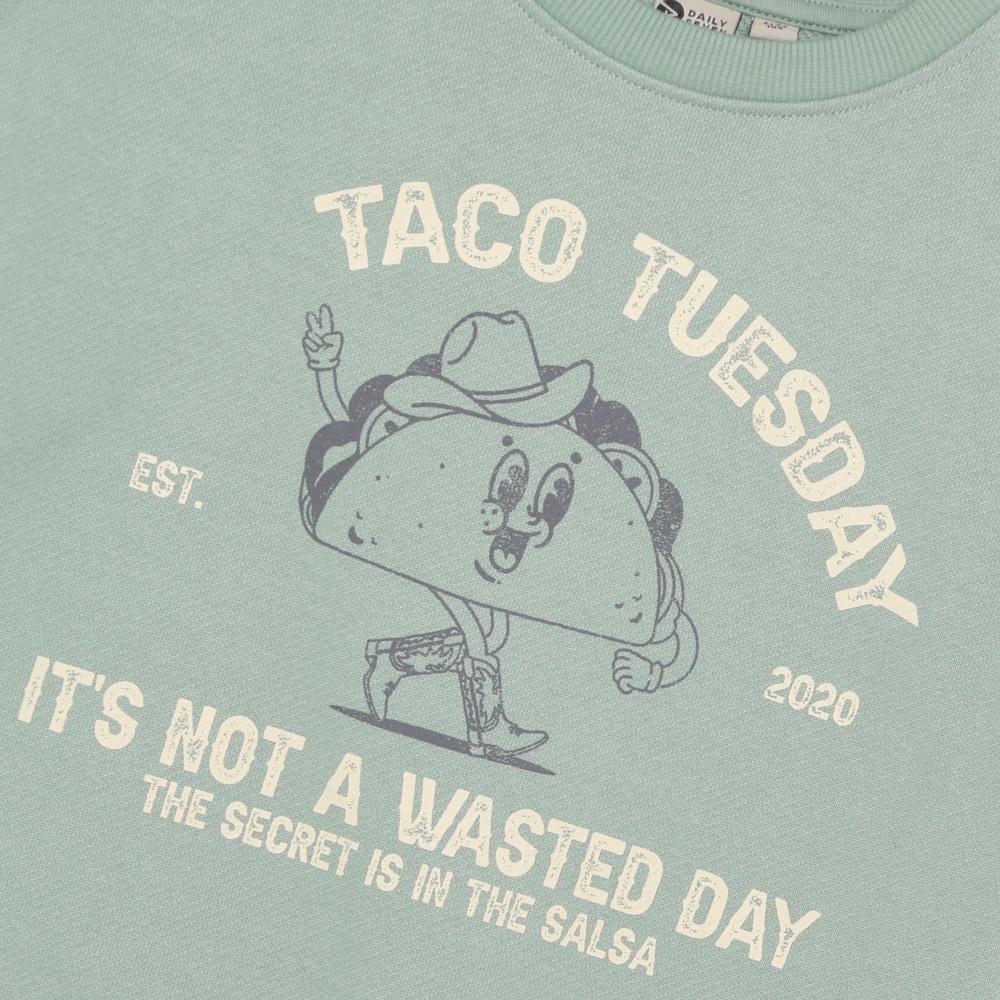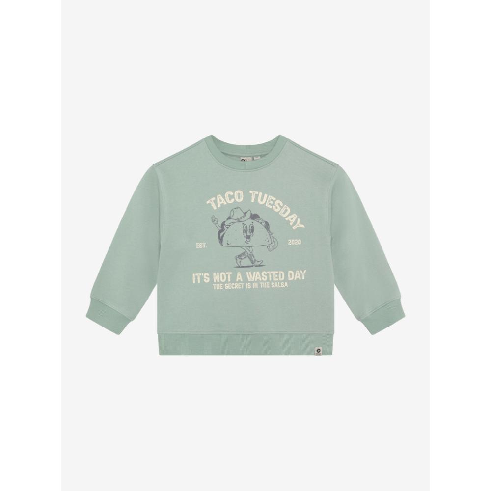 Daily7 – Oversized Sweater Taco Tuesday is de perfecte keuze voor kleine avonturiers die houden van comfort en stijl. Deze sweater biedt een heerlijke, losse pasvorm die kinderen de vrijheid geeft om te bewegen en te spelen, terwijl de zachte sage kleur een rustige en tijdloze uitstraling heeft. Ideaal voor elke dag, maar met een knipoog naar de speelsheid van Taco Tuesday.
