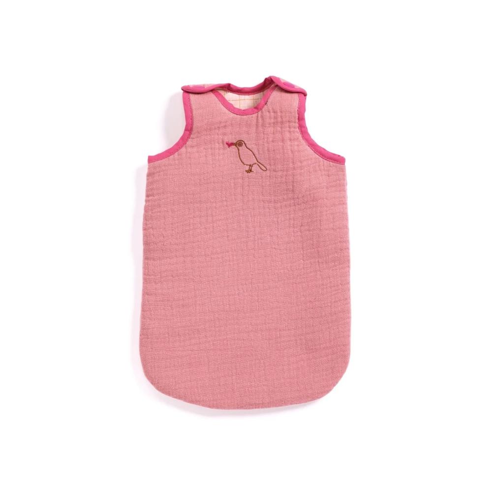 Een mooie roze slaapzak met een geborduurde vogel, waarin je baby heerlijk slaapt en het niet koud heeft! Met de klittenbandsluiting op de schouders kun je je baby heel gemakkelijk in de slaapzak doen. Een trendy slaapzak van goede kwaliteit met bedrukt katoen aan de binnenkant en geborduurd dubbel gaas aan de buitenkant. Een accessoire voor POMEA-poppen voor kinderen vanaf 18 maanden.