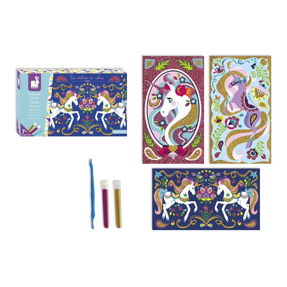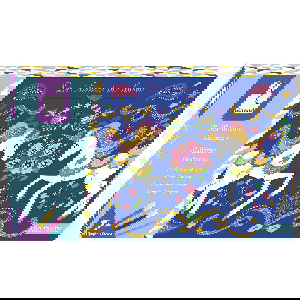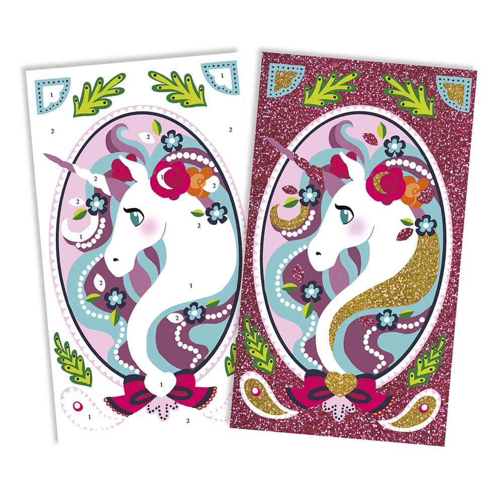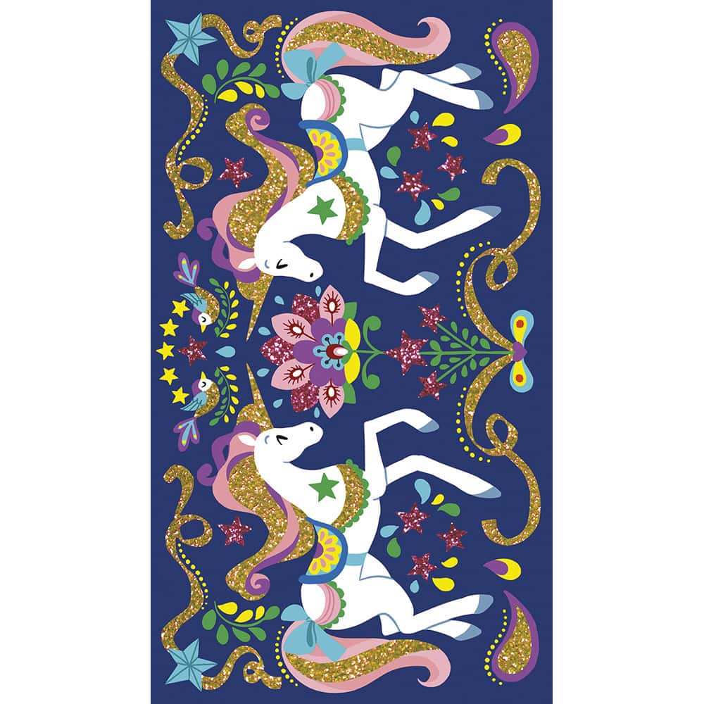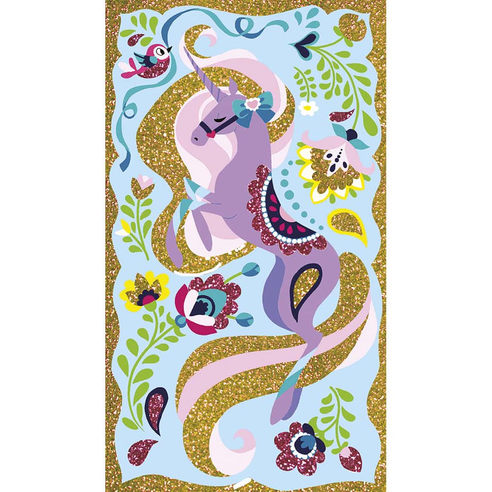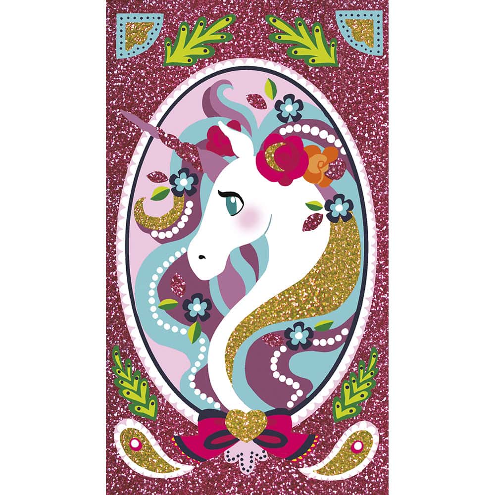 3 zelfklevende platen te versieren met 2 buisjes glitter, 1 spatel en 1 boekje met voorbeelden en handleiding.