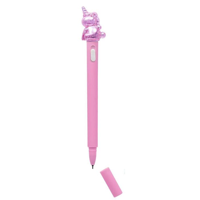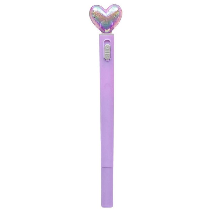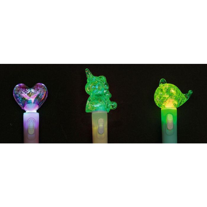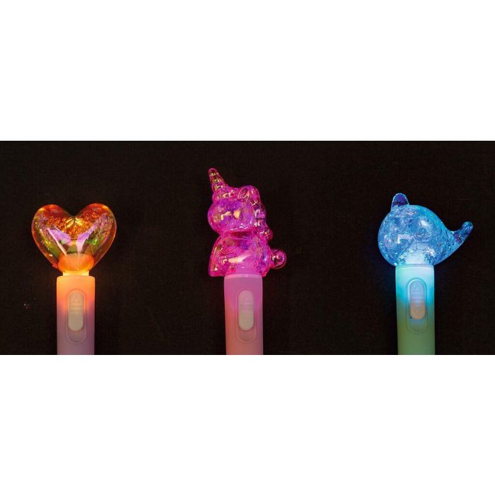 Lichtgevende glitter gelpennen met metallic toppers voorzien van kleur veranderend licht in de vorm van een hartje, walvis en eenhoorn. In stijlvolle pastel kleuren met glitters. Afmeting: 17.5 x 2.5 x 1.9 cm. Blauw schrijvend, met 3 verwisselbare knoopcelbatterijen (AG4).