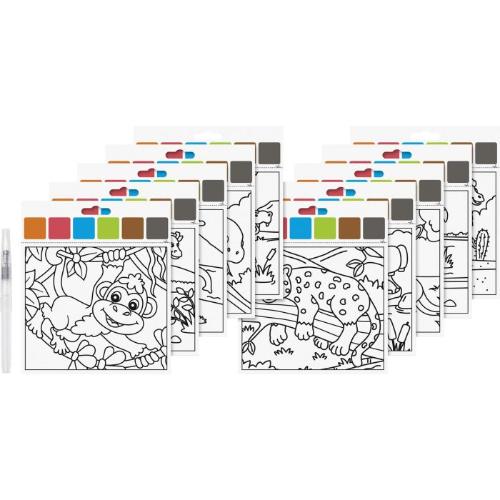 Schilderen met waterpen in het thema “dierentuin”. Elke tekening heeft bovenin 5 vakjes verf. Ga met je met water gevulde pen over de verf heen en schilder je tekening in met de bijpassende kleuren. Elke set bevat 10 motieven. Origineel knutselproject, al geschikt voor kinderen vanaf 5 jaar.
