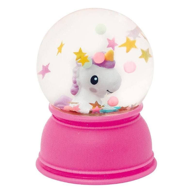 Sneeuwbollen die niet kapot kunnen vallen, uniek concept, gemaakt van softe onderkant en kunststof bol, gevuld met confetti en een regenboog, monster, axolotl of eenhoorn.