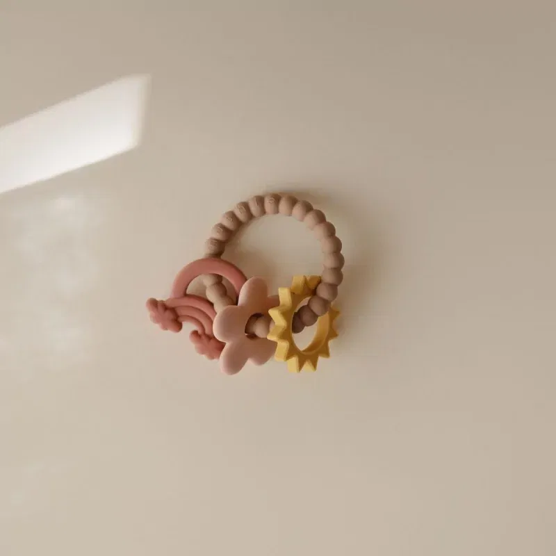 De bijtring heeft verschillende vormen en texturen, die de zintuigen van kinderen stimuleren terwijl ze hun tandvlees laten wegzakken in het zachte siliconenmateriaal van 100% voedingskwaliteit.