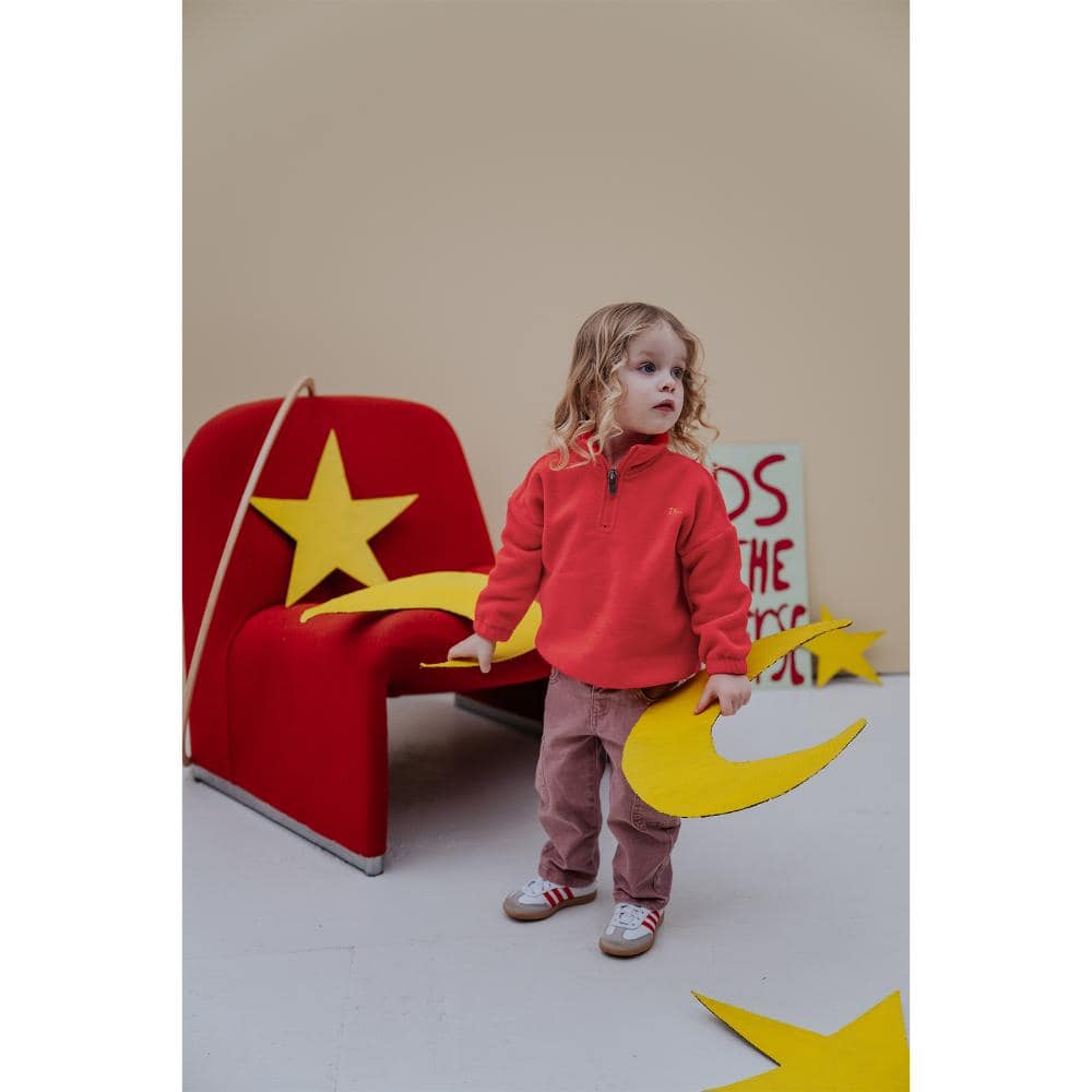 Gemaakt van hoogwaardig fleece materiaal, houdt de sweater je kind heerlijk warm tijdens koudere dagen. De zachte stof voelt prettig aan op de huid en biedt voldoende bewegingsvrijheid, zodat kinderen ongestoord kunnen spelen en ontdekken. Verkrijgbaar in een opvallende rode kleur, voegt deze sweater een speelse en levendige touch toe aan elke outfit.