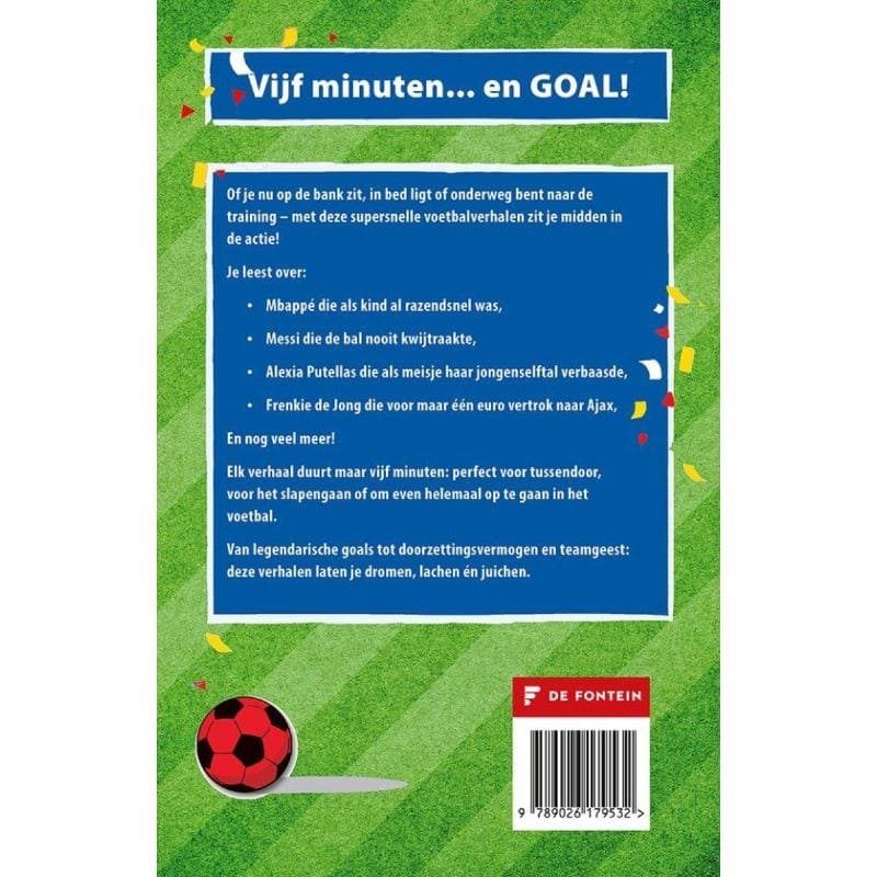 zoals Frenkie de Jong en Cody Gakpo, onwaarschijnlijke comebacks, de ergste rode kaarten en de vuilste voetbaltrucs. Elk verhaal duurt maar 5 minuten: perfect om tijdens het ontbijt, voor het slapengaan, of onderweg te lezen!